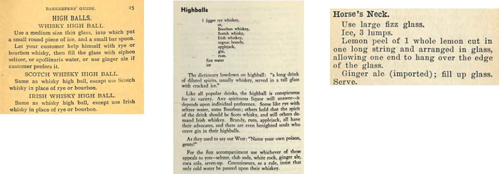 Als erstes möchte Ich die verschiedenen Whisky Highball Rezepte aus den Jahren 1904 und 1938 kurz präsentieren. Die Entwicklung der kohlensäurehaltigen Filler wird in dem Buch von Stanley Clisby Arthur 1938 dargestellt und hat einen großen Einfluss auf die Highballs gehabt. Dies ist auf die Entwicklung von Limonaden zurück zu führen. Vor allem Ginger Ale spielt eine große Rolle für den Horse´s Neck Highball und ist bis heute bei der individuellen Zusammenstellung des Whiskey als Highball relevant.