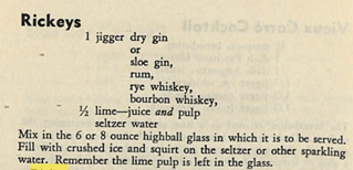 Die Definition von einem Rickey: “Ein Getränk aus einer Basisspirituose, Limettensaft und Club Soda, das über Eis in einem Highball-Glas serviert wird, mit einem optionalen Limette zum Garnieren.” so Regan, Mardee Haidin aus The Bartender´s Best Friend, S. 9936. Eine Rezeptur des Rickey ist von Stanley Clisby Arthur in seinem Buch Famous New Orleans drinks and How to mix´em im Bild illustriert.