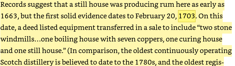 Curtis, Wayne. And a Bottle of Rum: A History of the New World in Ten Cocktails. 1st ed., Crown Publishing Group, 2007. “Aufzeichnungen deuten darauf hin, dass hier bereits 1663 ein Destillation Haus Rum produzierte, aber die ersten soliden Beweise ist am 20. Februar 1703 datiert.” S. 24 „Der Haupt Trank, den sie auf der Insel machen, ist Rumbullion, alias Kill-Divil, und das besteht aus Zuckerrohr…” S. 24