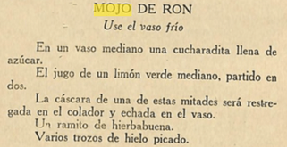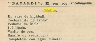 1930 Club de Cantineros de La Republica de Cuba: Manual Oficial. https://euvs-vintage-cocktail-books.cld.bz/1930-Club-de-Cantineros-de-la-Republica-de-Cuba-Manual-Oficial/112/. Accessed 08 Jan. 2021. Mojito aus dem Rezept Buch Club de Cantineros de la Republica de Cuba, Manual Oficial S. ‘‘Bacardi: Der Rum für Exellenz.’’