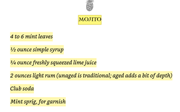 ‘‘In Highball Glas. Teelöffel Zucker. Eisbrocken. ½ Limette. Glas Rum. Pfefferminzzweig. Aufgefüllt mit spritzigem Wasser.’’